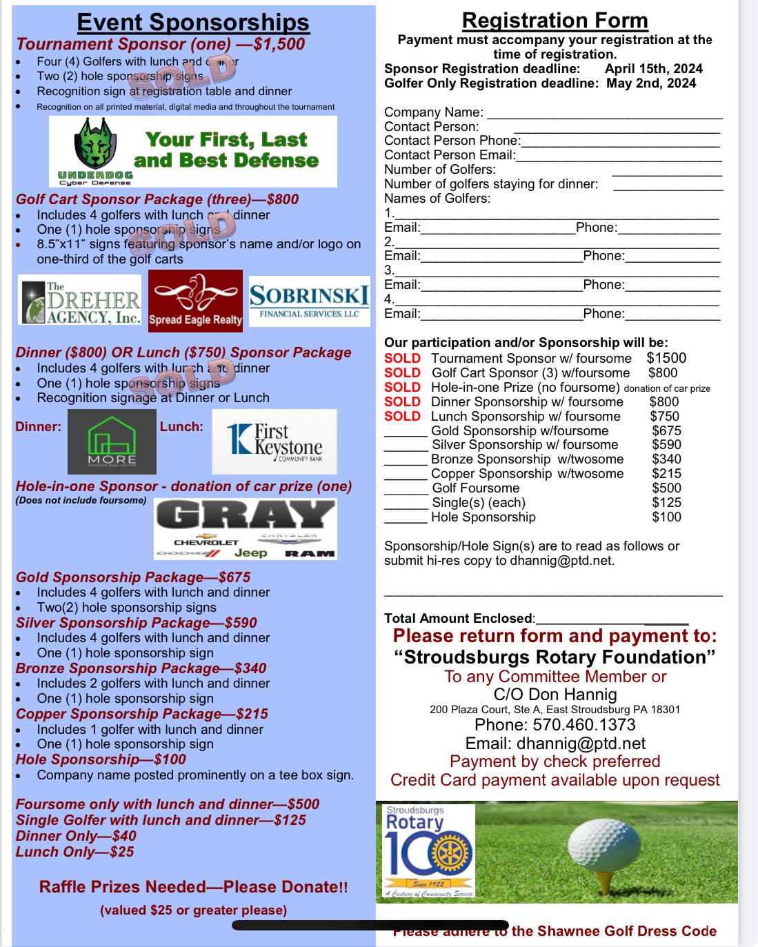 Stroudsburgs Rotary is hosting their 2024 Annual Golf Outing on May 16 at Shawnee Inn and Golf Resort. Registration and Lunch at 11:30 a.m. with a shotgun start at 1 p.m. The day concludes with dinner at 6 p.m. Discounts for foursomes ($500) and single golfers $125. For more information or to register contact Don Hannig at 570-460-1373 or email dhannig@ptd.net.