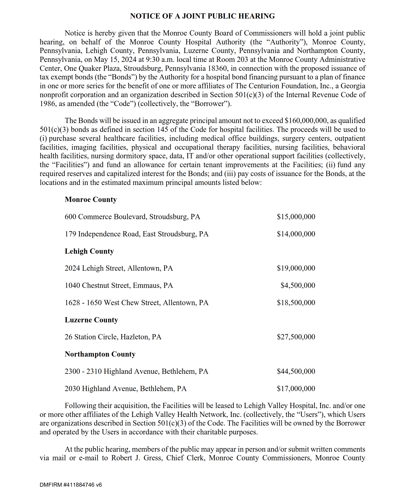 Notice is hereby given that the Monroe County Board of Commissioners will hold a joint public hearing, on behalf of the Monroe County Hospital Authority (the “Authority”), Monroe County, Pennsylvania, Lehigh County, Pennsylvania, Luzerne County, Pennsylvania and Northampton County, Pennsylvania, on May 15, 2024 at 9:30 a.m. local time at Room 203 at the Monroe County Administrative Center, One Quaker Plaza, Stroudsburg, Pennsylvania 18360, in connection with the proposed issuance of tax exempt bonds (the “Bonds”) by the Authority for a hospital bond financing pursuant to a plan of finance in one or more series for the benefit of one or more affiliates of The Centurion Foundation, Inc., a Georgia nonprofit corporation and an organization described in Section 501(c)(3) of the Internal Revenue Code of 1986, as amended (the “Code”) (collectively, the “Borrower”).