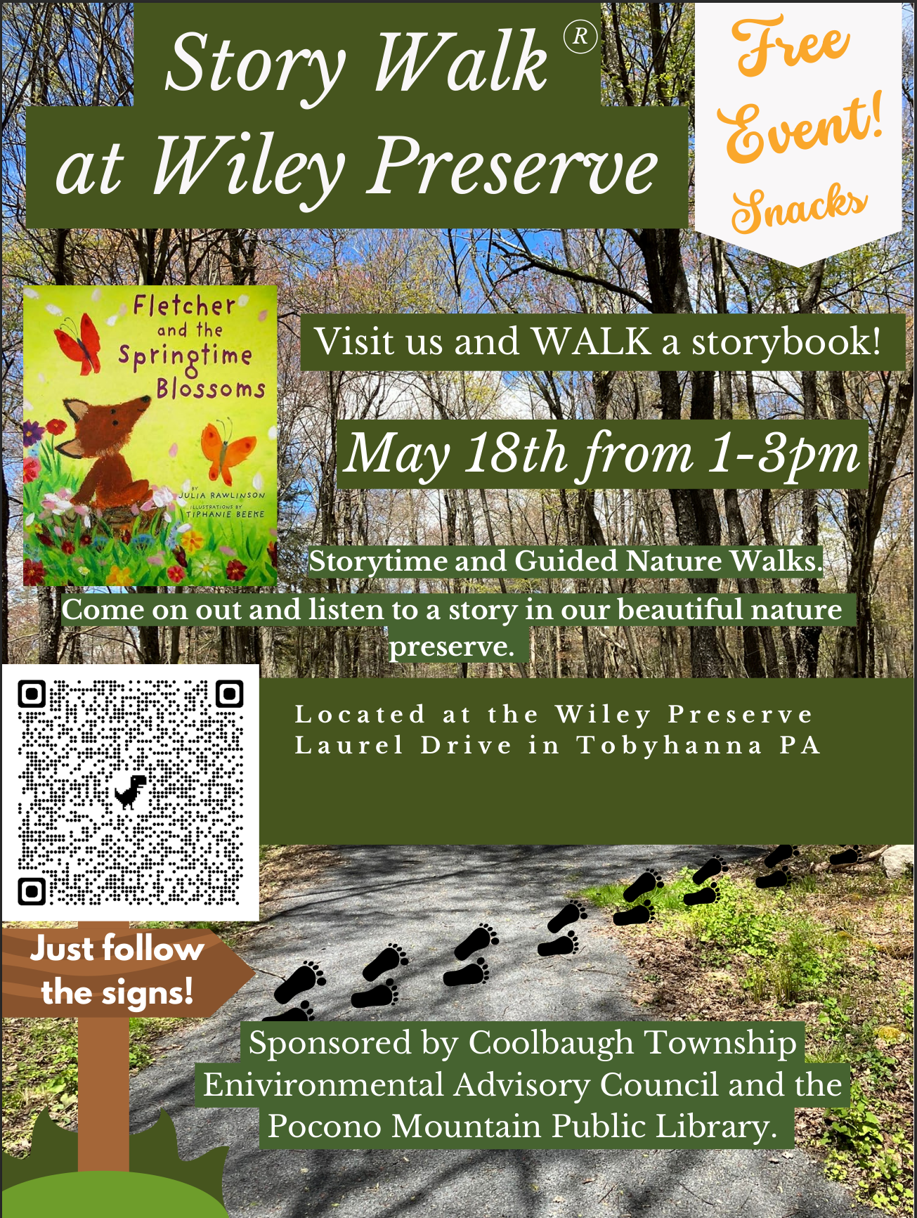 Join the Coolbaugh Township Environmental Advisory Council and the Pocono Mountain Public Library for a Story Walk at the Wiley Preserve located at 549 Laurel Drive, Tobyhanna. The Story Walk is being held on Saturday May 18, 2024 from 1-3pm. The featured book is Fletcher and the Springtime Blossoms by Julia Rawlinson. This is a Free event that is open to the public. Come on out and experience a great day of reading along the trail.