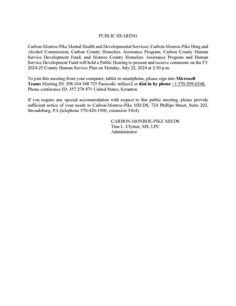 CMP Mental Health & Developmental services are holding a public hearing to present and receive comments on the FY 2024-2025 County Human Service Plan on Monday, July 22nd at 2:30PM. To join online, follow the Meeting ID.