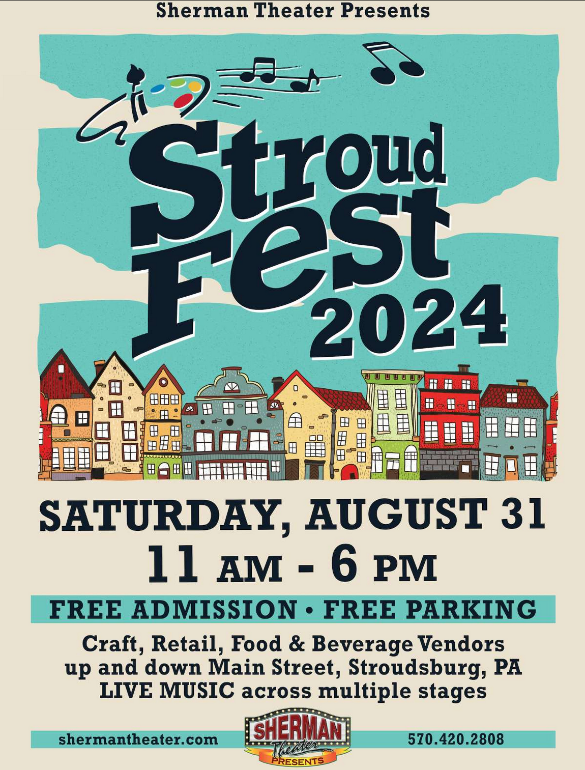 StroudFest – FREE COMMUNITY EVENT – The Sherman Theater presents the 15th annual Labor Day Festival on Saturday, August 31 from 11:00 AM to 6:00 PM! Craft, retail, food and beverage vendors will line the sidewalks on Main Street from 5th to 9th Street, featuring a food court in Courthouse Square, complementing dozens of eclectic shops and restaurants downtown. There will be live music at multiple stages throughout the day, and lots of activities for the whole family to enjoy!