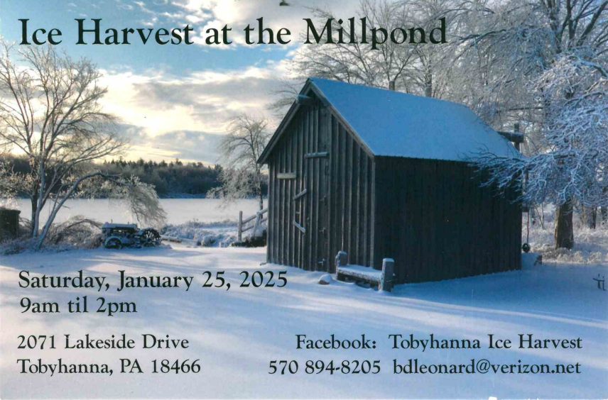 The Tobyhanna Ice Harvest is scheduled for Saturday, January 25, 2025 from 9am-2pm and will be held at 2071 Lakeside Drive, Tobyhanna, PA 18466. Please visit their Facebook page: Tobyhanna Ice Harvest for more information or call 570.894.8205.
