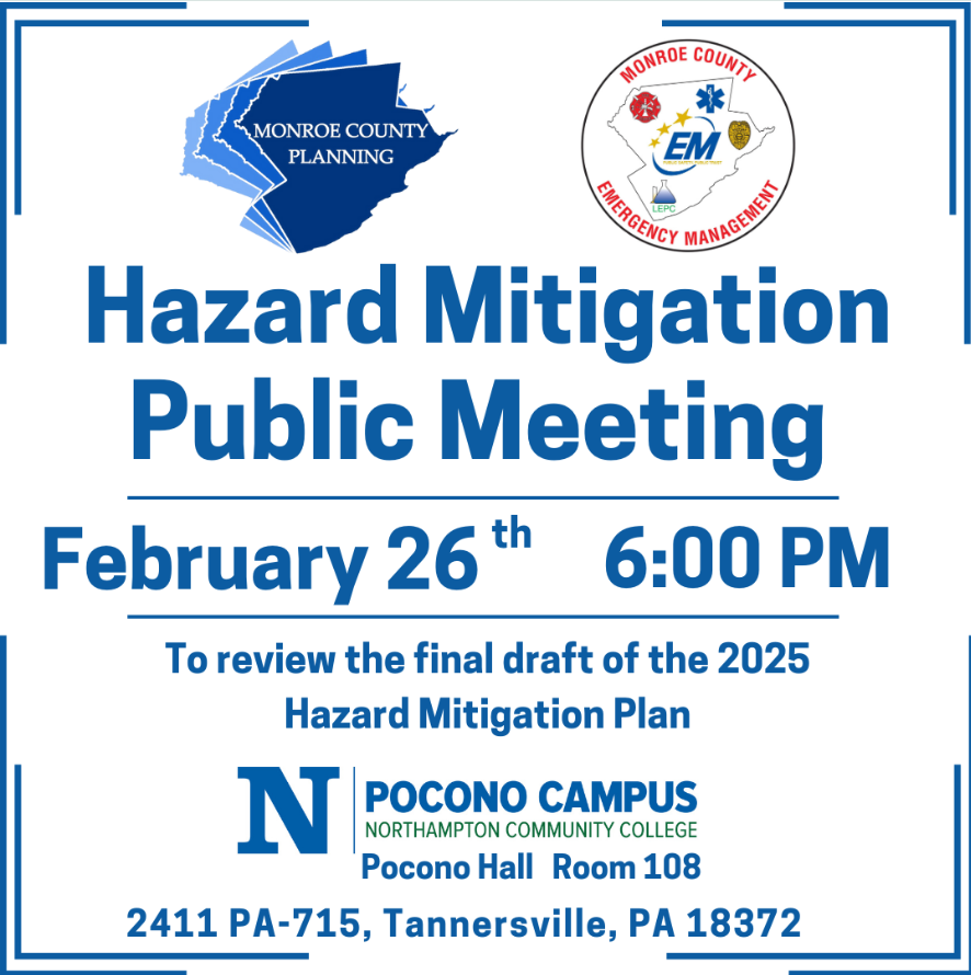 Monroe County Hazard Mitigation Public Hearing will be held on February 26, 2025 at 6:00PM at the Northampton Community College, Pocono Campus located at 2411 PA-715, Tannersville, PA 18372 in the Pocono Hall Room 108. Please see the flyer for more information.