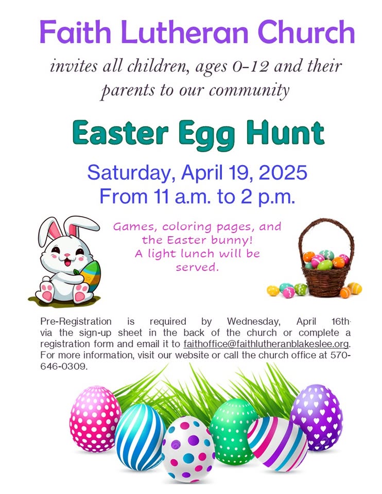 Faith Lutheran Church invites all children, ages 0-12 and their parents to our community Easter Egg Hunt. Saturday, April 19, 2025 from 11 a.m. to 2 p.m.