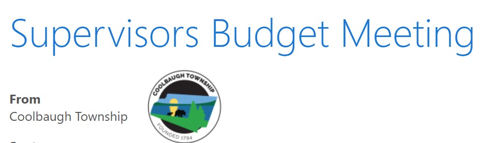 Notice is hereby given that the Coolbaugh Township Board of Supervisors' Budget Meeting scheduled for Thursday, October 16th, 2025 will be held beginning at 6:30 PM at the Coolbaugh Township Municipal Center located at 5520 Municipal Drive, Tobyhanna, PA. To view the meeting agenda, please visit our website at: http://coolbaughtwp.org/wp-content/uploads/2025/10/101625-Budget-Work-Session-Agenda.pdf
