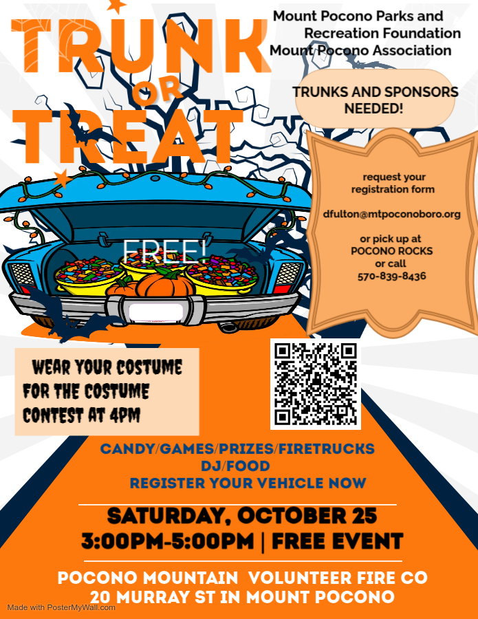 Make sure to register your car today for the Trunk or Treat event! Scan the QR code or click the link to sign up! https://form.jotform.com/mountpoconoboro/trunk-or-treat