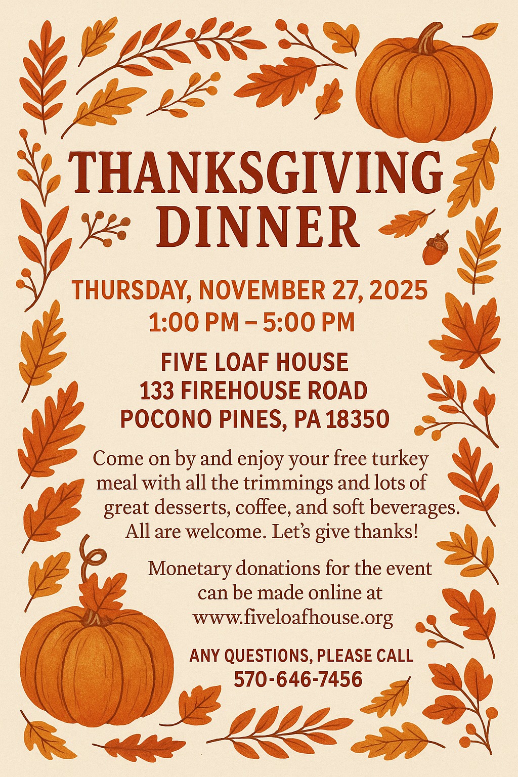 Come by and enjoy your free turkey meal all the trimmings and lots of great desserts, coffee, and soft beverages.