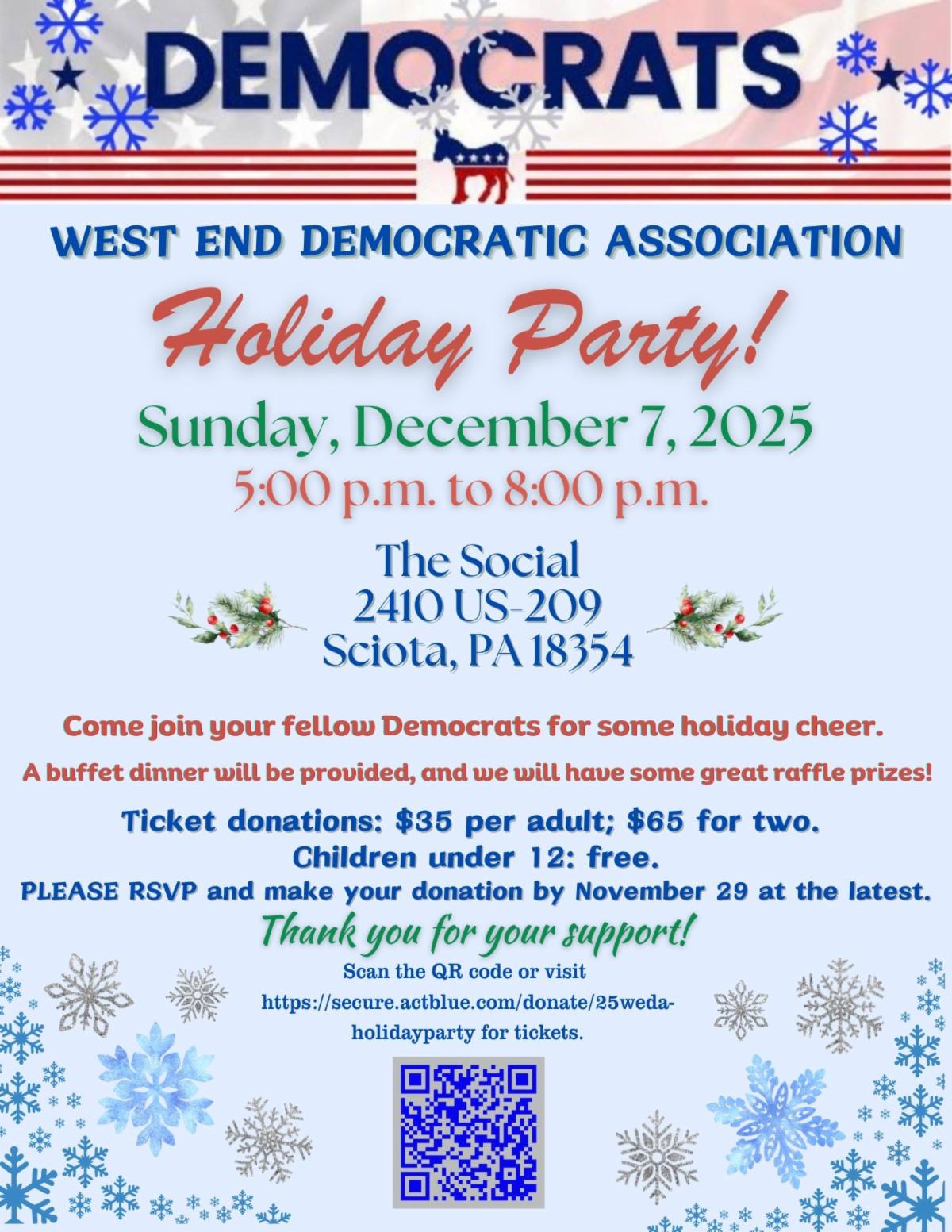 Come join your fellow Democrats for some holiday cheer! The WEDA Holiday Party is on Sunday, December 7, 2025, from 5 to 8 p.m.