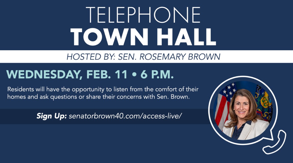 Senator Rosemary Brown will be hosting a Tele-Town Hall on Wednesday, February 11th at 6 PM. This will give residents the opportunity to listen from the comfort of their homes and ask questions or share your concerns with the Senator.