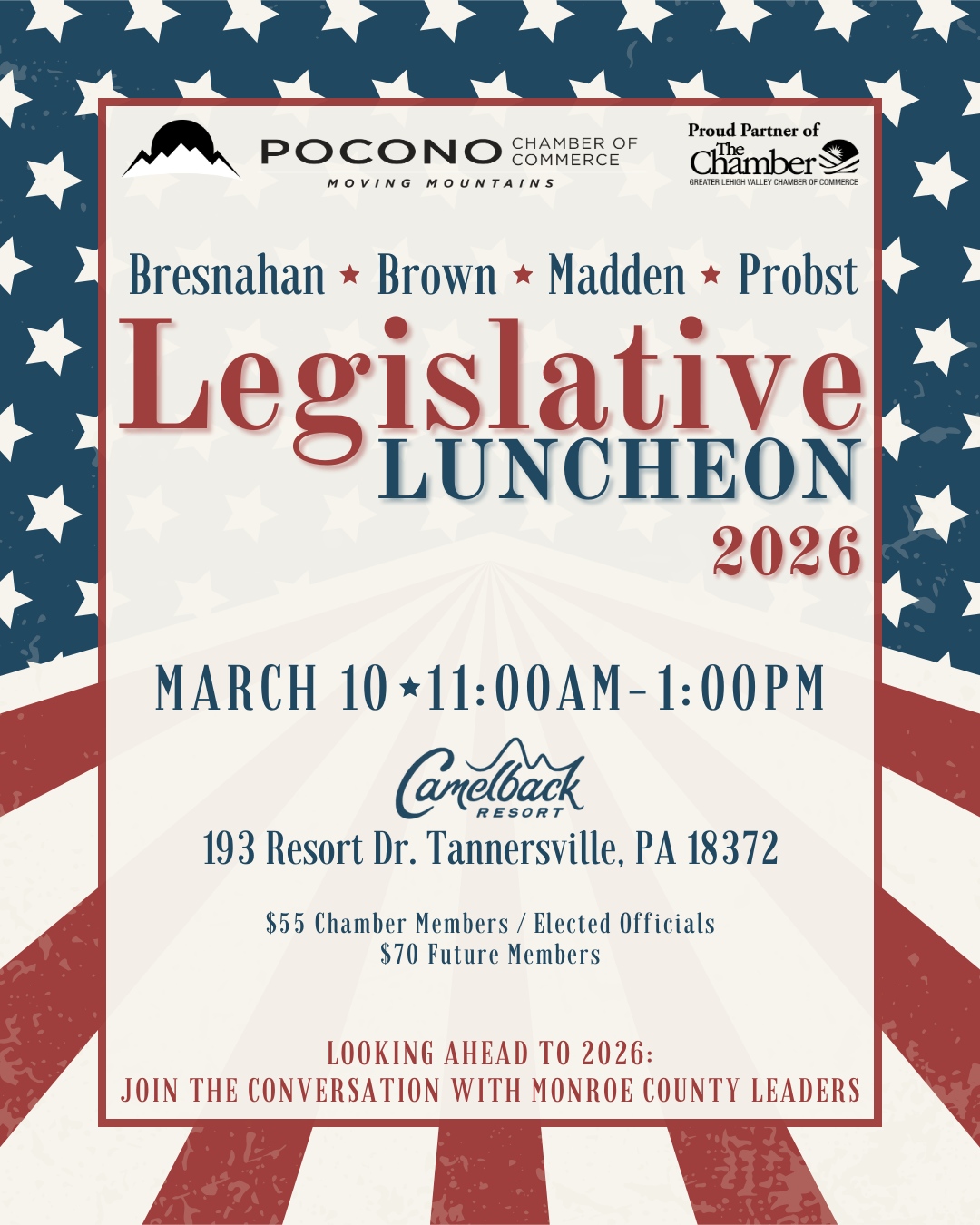 The Pocono Chamber of Commerce Legislative Luncheon will be held on Tuesday, March 10, 2025, at 11:00 AM. Hear from Congressman Rob Bresnahan, Senator Rosemary Brown, Representative Maureen Madden, and Representative Tarah Probst as they discuss upcoming developments for Monroe County in 2026!