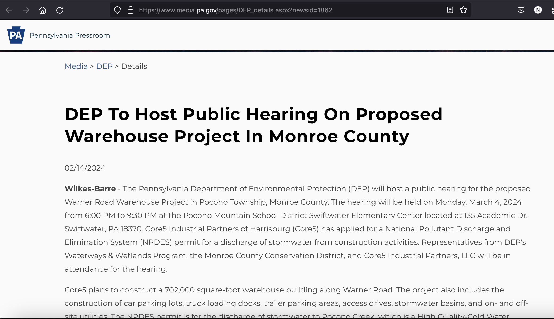 Wilkes-Barre - The Pennsylvania Department of Environmental Protection (DEP) will host a public hearing for the proposed Warner Road Warehouse Project in Pocono Township, Monroe County. The hearing will be held on Monday, March 4, 2024 from 6:00 PM to 9:30 PM at the Pocono Mountain School District Swiftwater Elementary Center located at 135 Academic Dr, Swiftwater, PA 18370. Core5 Industrial Partners of Harrisburg (Core5) has applied for a National Pollutant Discharge and Elimination System (NPDES) permit for a discharge of stormwater from construction activities. Representatives from DEP's Waterways & Wetlands Program, the Monroe County Conservation District, and Core5 Industrial Partners, LLC will be in attendance for the hearing.