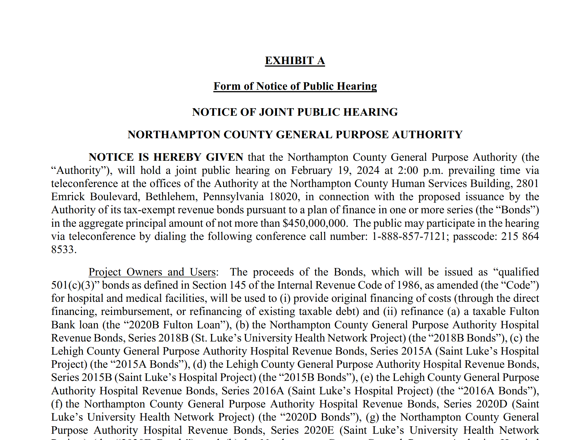 NOTICE IS HEREBY GIVEN that the Northampton County General Purpose Authority (the “Authority”), will hold a joint public hearing on February 19, 2024 at 2:00 p.m. prevailing time via teleconference at the offices of the Authority at the Northampton County Human Services Building, 2801 Emrick Boulevard, Bethlehem, Pennsylvania 18020, in connection with the proposed issuance by the Authority of its tax-exempt revenue bonds pursuant to a plan of finance in one or more series (the “Bonds”) in the aggregate principal amount of not more than $450,000,000. The public may participate in the hearing via teleconference by dialing the following conference call number: 1-888-857-7121; passcode: 215 864 8533.