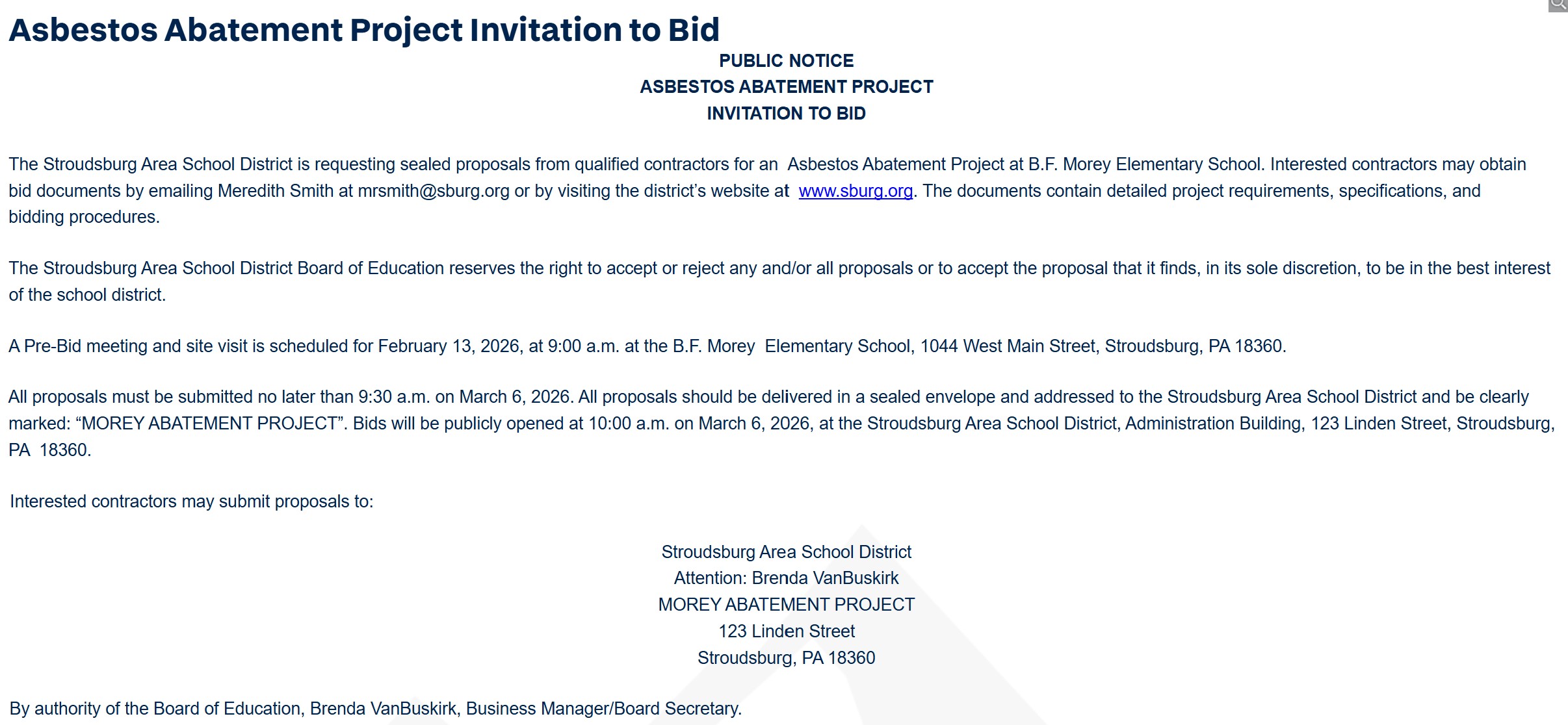 All proposals must be submitted no later than 9:30 a.m. on March 6, 2026. All proposals should be delivered in a sealed envelope and addressed to the Stroudsburg Area School District and be clearly marked: “MOREY ABATEMENT PROJECT”. Bids will be publicly opened at 10:00 a.m. on March 6, 2026, at the Stroudsburg Area School District, Administration Building, 123 Linden Street, Stroudsburg, PA 18360.