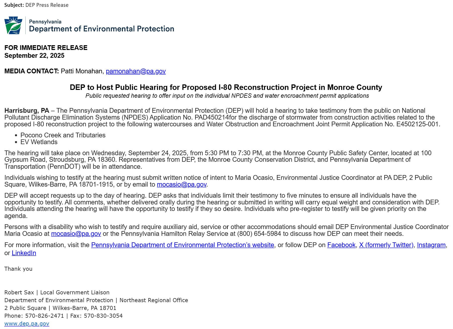 The hearing will take place on Wednesday, September 24, 2025, from 5:30 PM to 7:30 PM, at the Monroe County Public Safety Center, located at 100 Gypsum Road, Stroudsburg, PA 18360. Representatives from DEP, the Monroe County Conservation District, and Pennsylvania Department of Transportation (PennDOT) will be in attendance.