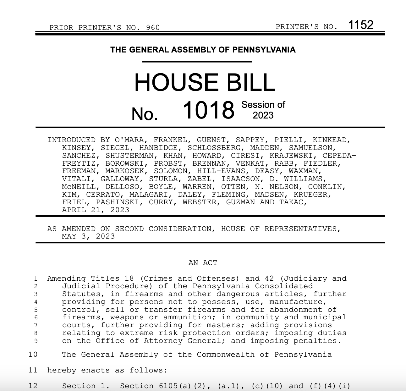 HB1018 passed the PA House 102-99 on May 22, 2023. It would allow the removal of a person's firearms with no due process, the subject of such orders is typically informed of the action through the execution of a no-knock warrant at their home. Please contact District 40 Senator, Rosemary Brown, at 570-620-4326 to tell her you strongly oppose HB1018. Don't be fooled by supporters of this bill who refer to it as "extreme risk protection orders" - this legislation would bring RED FLAG LAWS to Pennsylvania. Red flag laws are easily abused by bad actors to deprive a person of their 2nd amendment rights, putting them in a position to prove that they are "worthy" of owning their firearms and often costing them a great deal of money.
