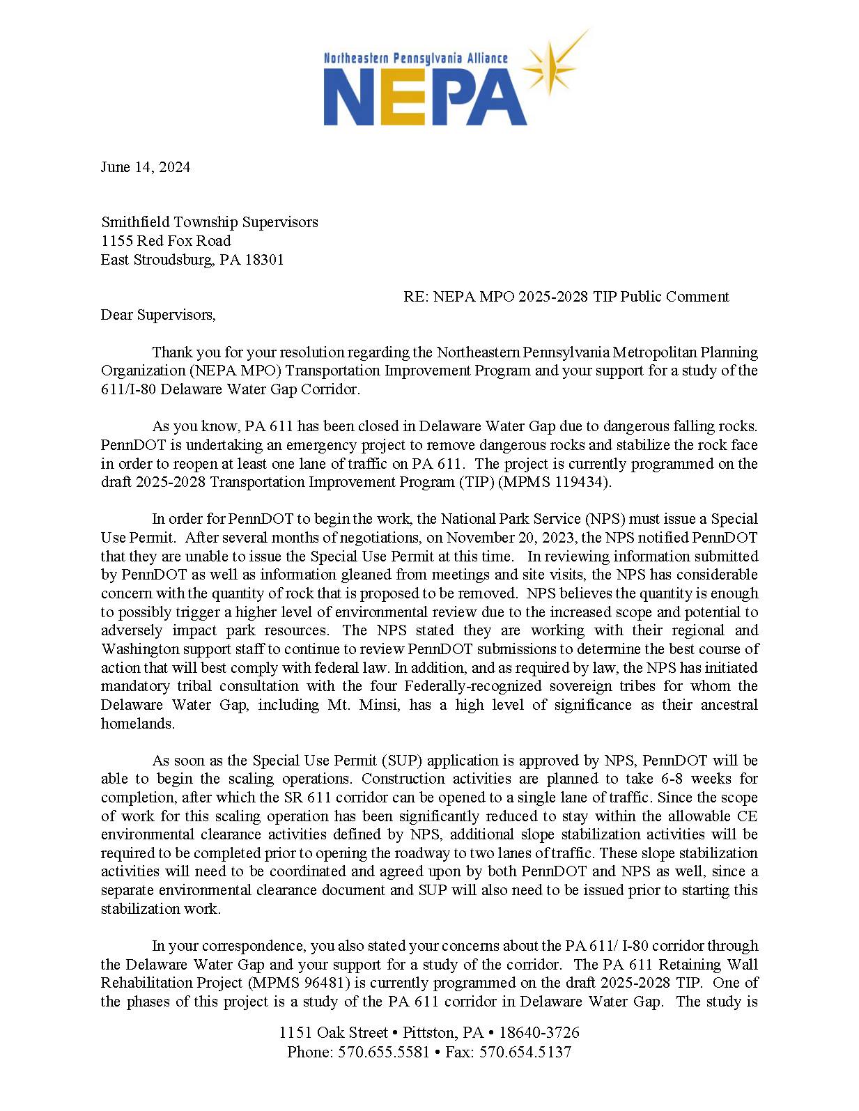 Smithfield Township for passing Resolution No. 533, asking NEPA-Alliance to add a 611 DWG Corridor Study to the 2025-2028 TIP and to prioritize funding for the 611 planned projects. (Added to photo.)