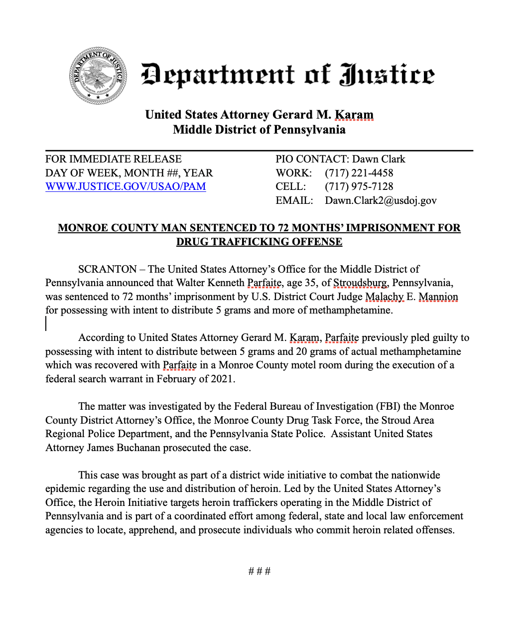 According to United States Attorney Gerard M. Karam, Parfaite previously pled guilty to possessing with intent to distribute between 5 grams and 20 grams of actual methamphetamine which was recovered with Parfaite in a Monroe County motel room during the execution of a federal search warrant in February of 2021.