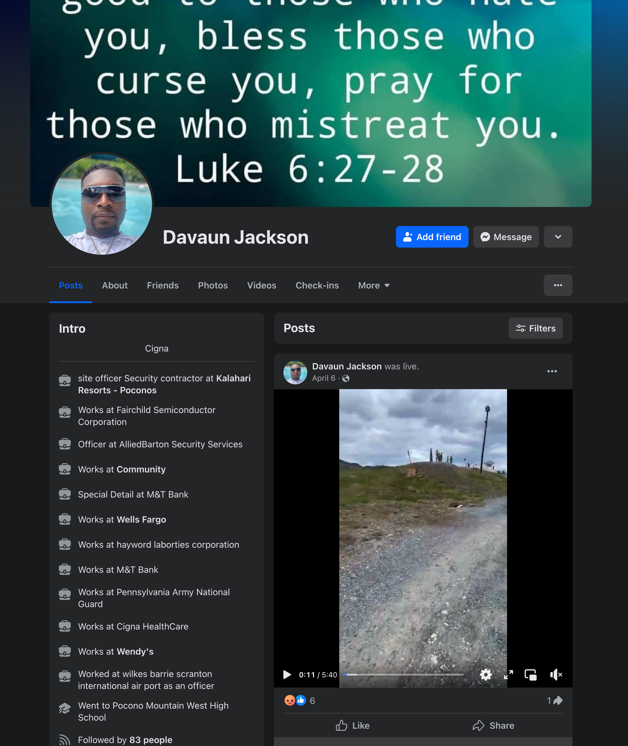 Jackson's previous employment history, based on his Facebook profile, includes positions such as site officer security contractor at Kalahari Resorts - Poconos, officer at AlliedBarton Security Services, and various roles at companies like Fairchild Semiconductor Corporation, M&T Bank, Wells Fargo, Hayward Laboratories Corporation, Cigna HealthCare, and Wendy's. He also worked as an officer at Wilkes-Barre Scranton International Airport and attended Pocono Mountain West High School.