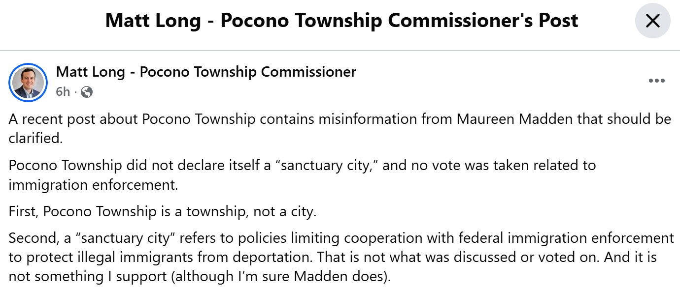 Pocono Township did not declare itself a “sanctuary city,” and no vote was taken related to immigration enforcement.