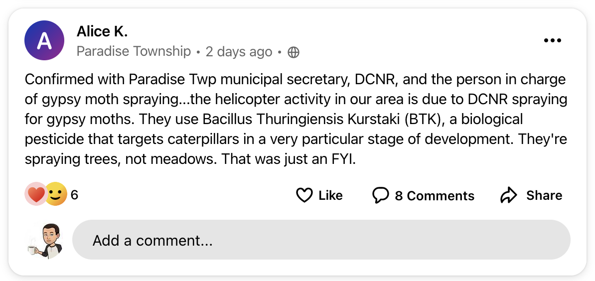 Confirmed with Paradise Twp municipal secretary, DCNR, and the person in charge of gypsy moth spraying...the helicopter activity in our area is due to DCNR spraying for gypsy moths. They use Bacillus Thuringiensis Kurstaki (BTK), a biological pesticide that targets caterpillars in a very particular stage of development. They're spraying trees, not meadows. That was just an FYI.