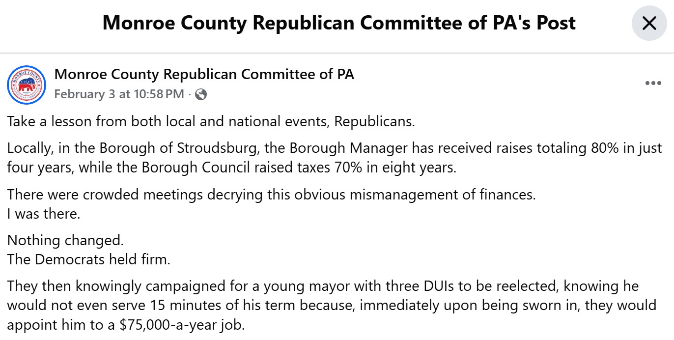 Locally, in the Borough of Stroudsburg, the Borough Manager has received raises totaling 80% in just four years, while the Borough Council raised taxes 70% in eight years.